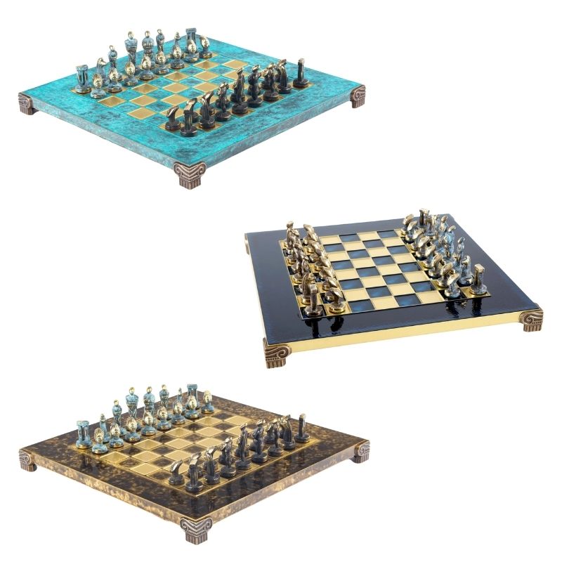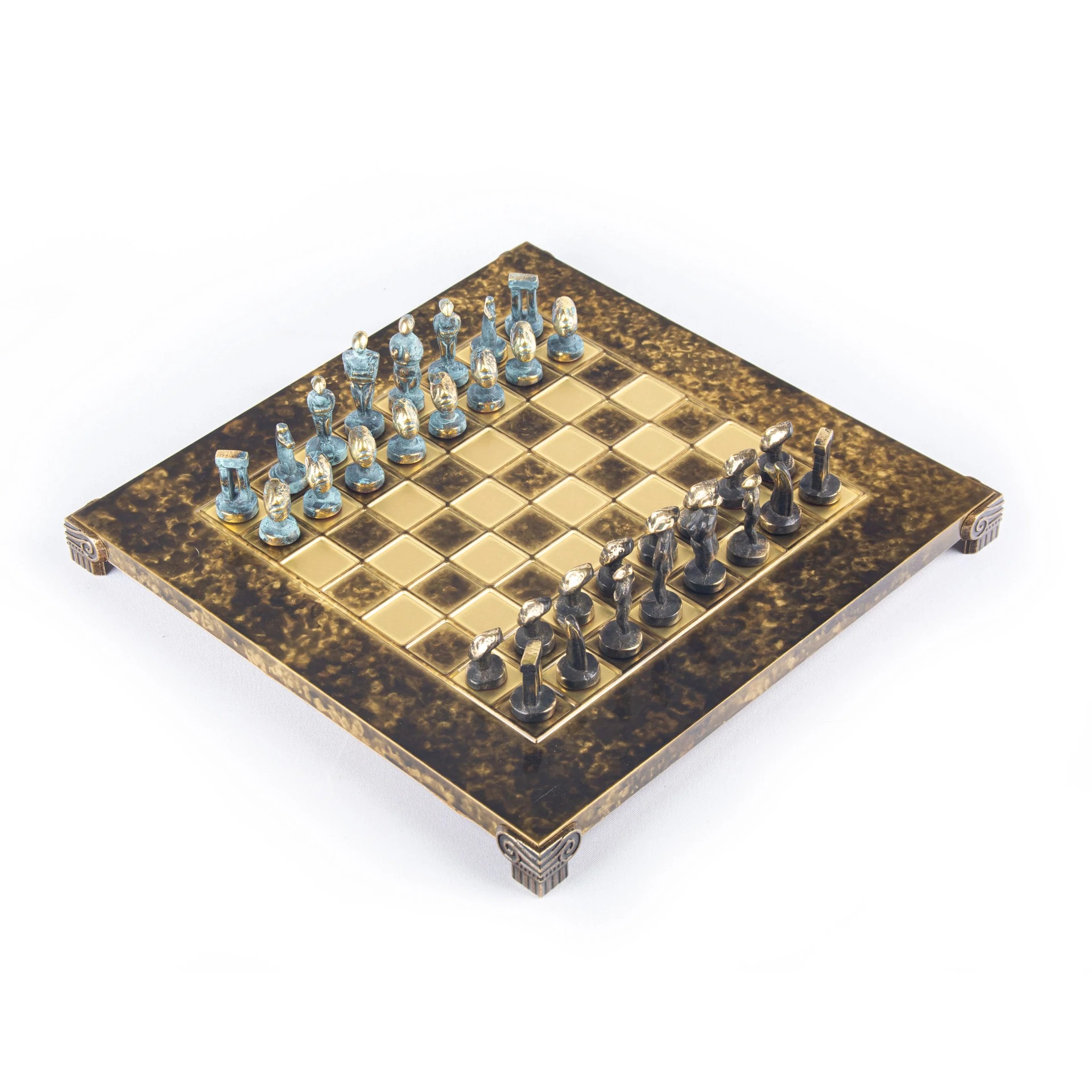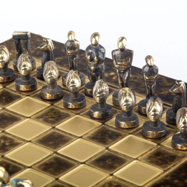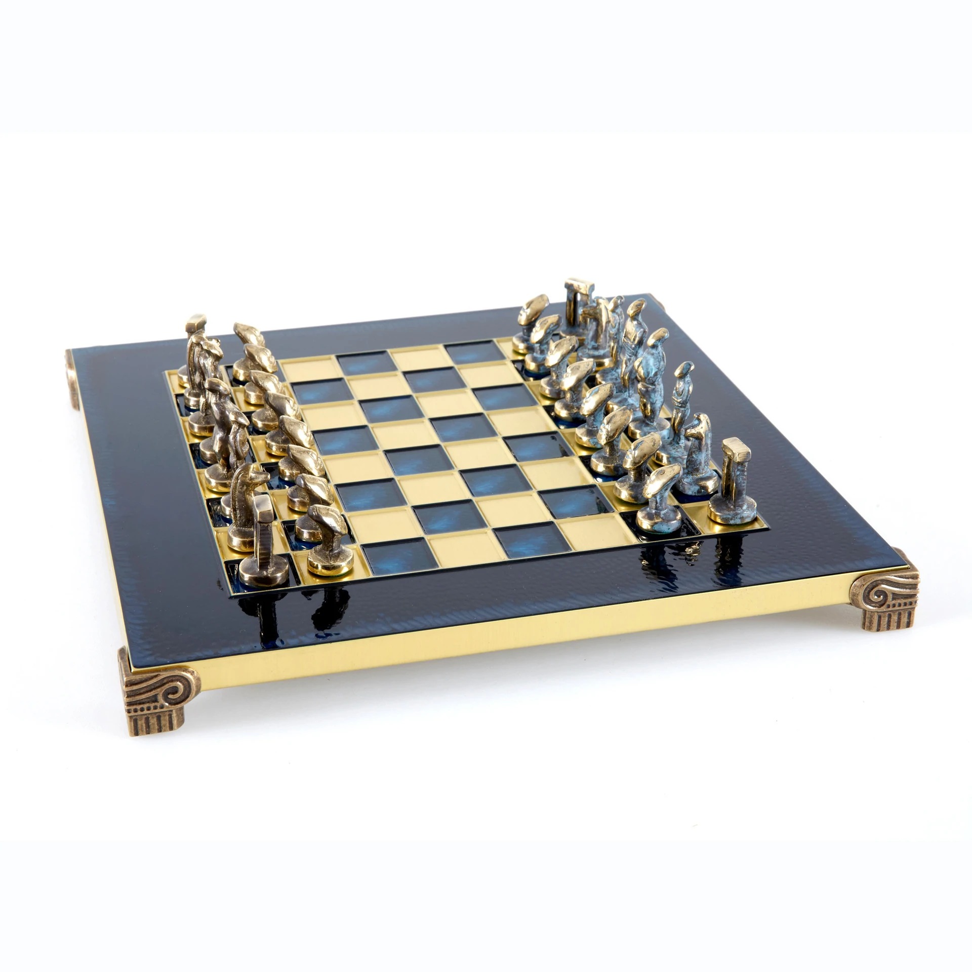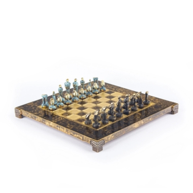 Las piezas de ajedrez, realizadas en latón en tonos bronce y azul, están cuidadosamente elaboradas y tienen una altura de rey de 5,2 cm.