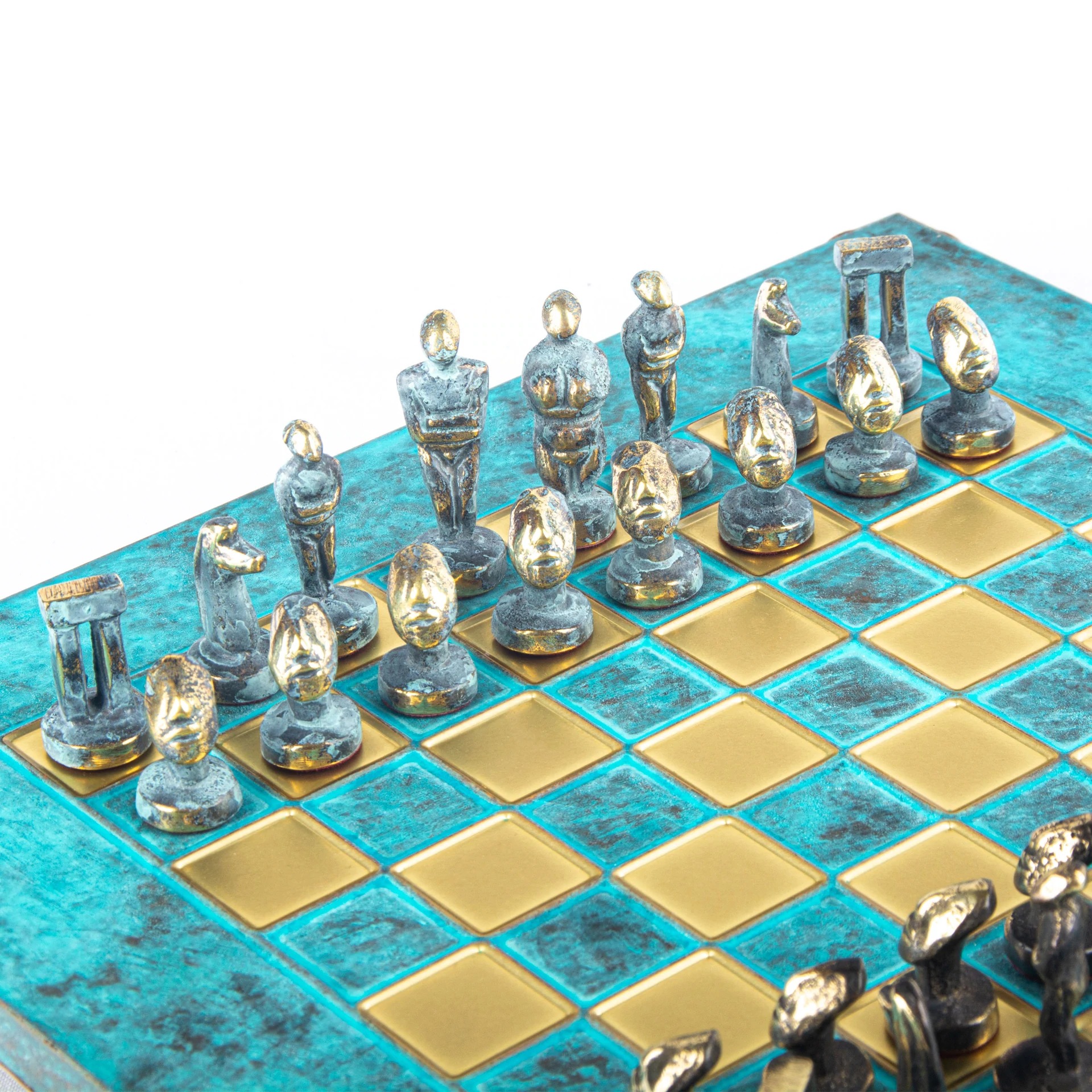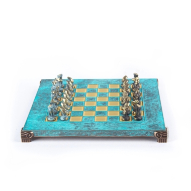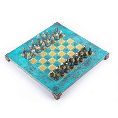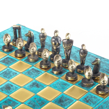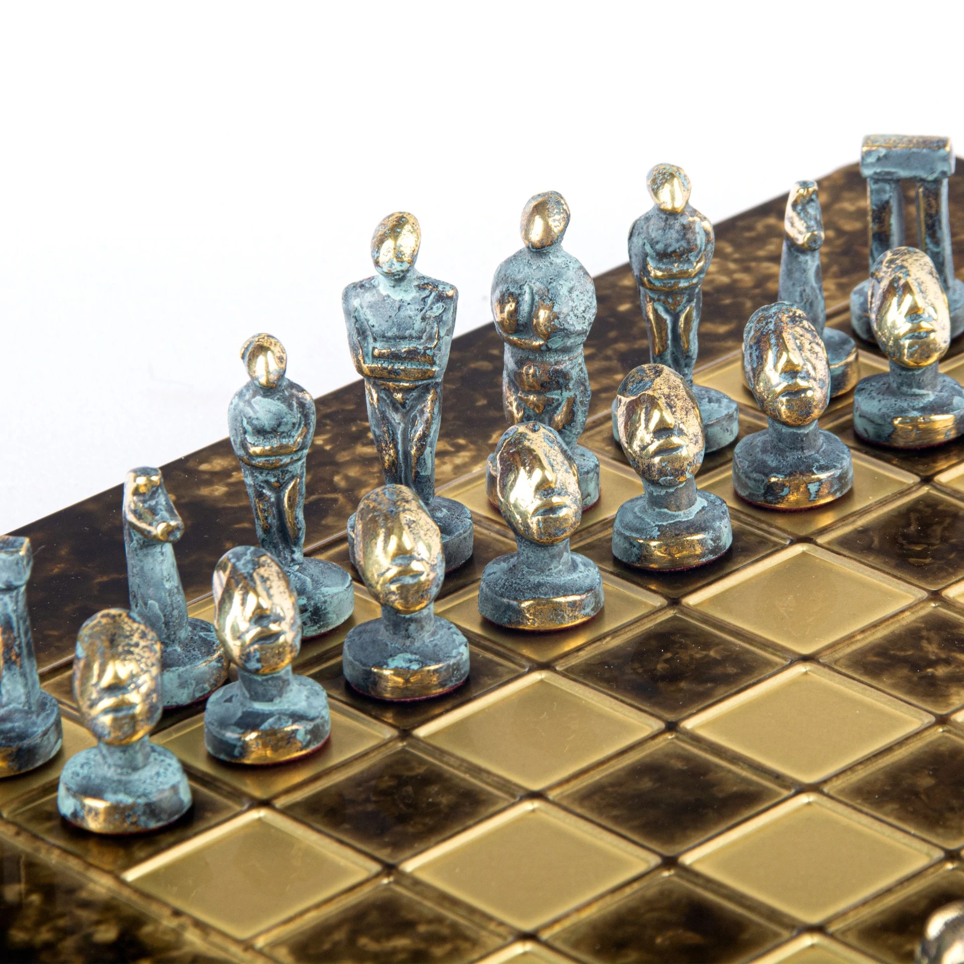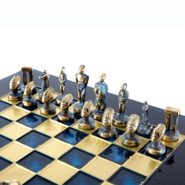 Pequeño Juego de Ajedrez Arte Cicládico en Latón Bronce y Azul – Tablero de Metal y Caja de Madera Laminada