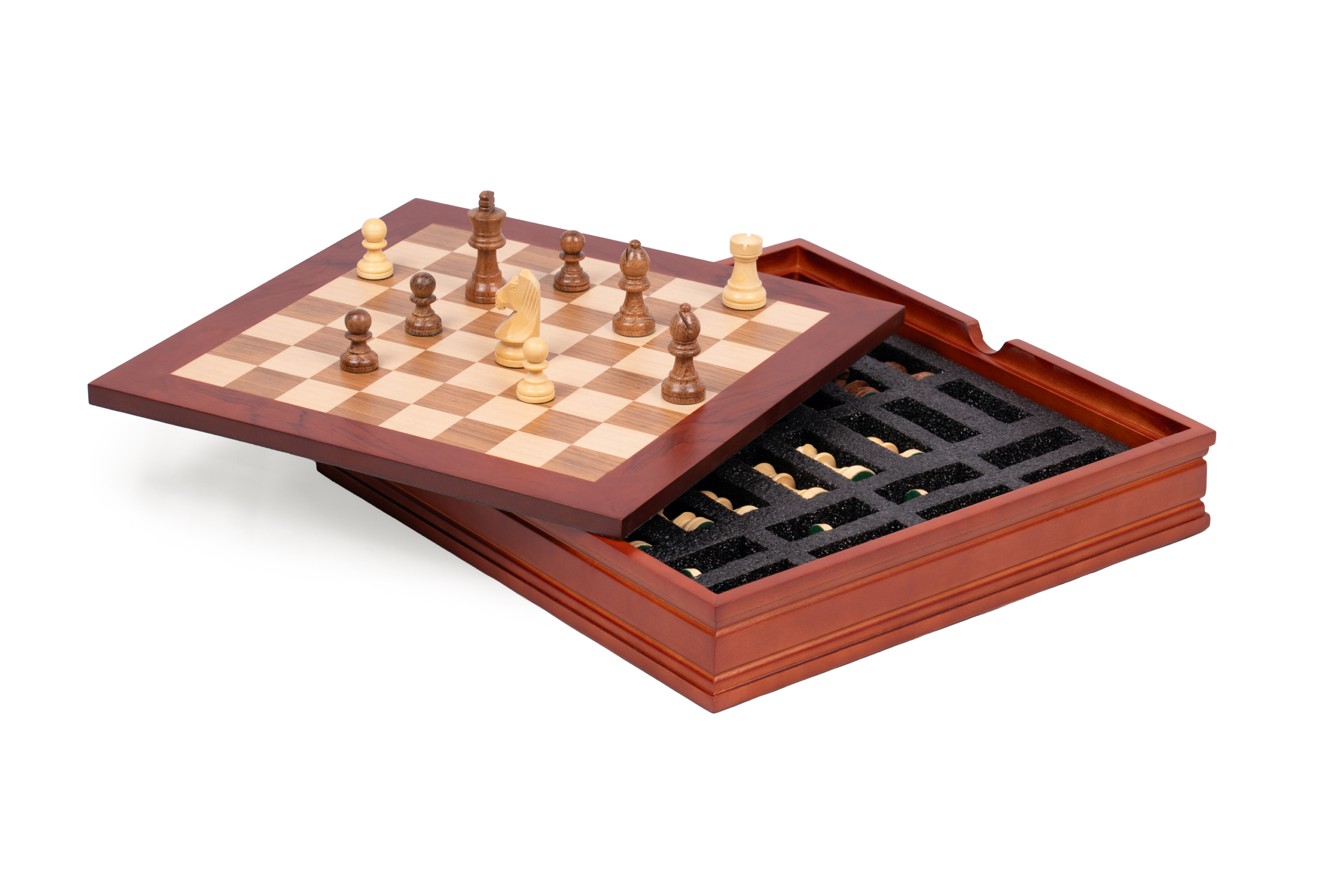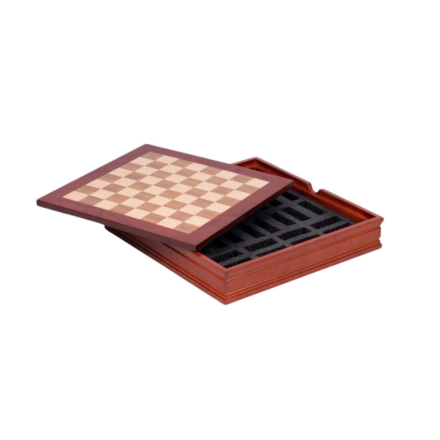 El tablero de ajedrez es de madera de nogal y arce de alta calidad, finamente marquetado, para un aspecto lujoso que se combina perfectamente con las piezas. Con unas dimensiones de 28 x 28 cm, cuenta con un compartimento de almacenamiento integrado, diseñado para albergar cada pieza de forma segura después de cada partida. Este almacenamiento práctico y discreto permite mantener tus piezas de ajedrez organizadas y protegidas.