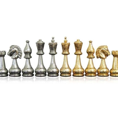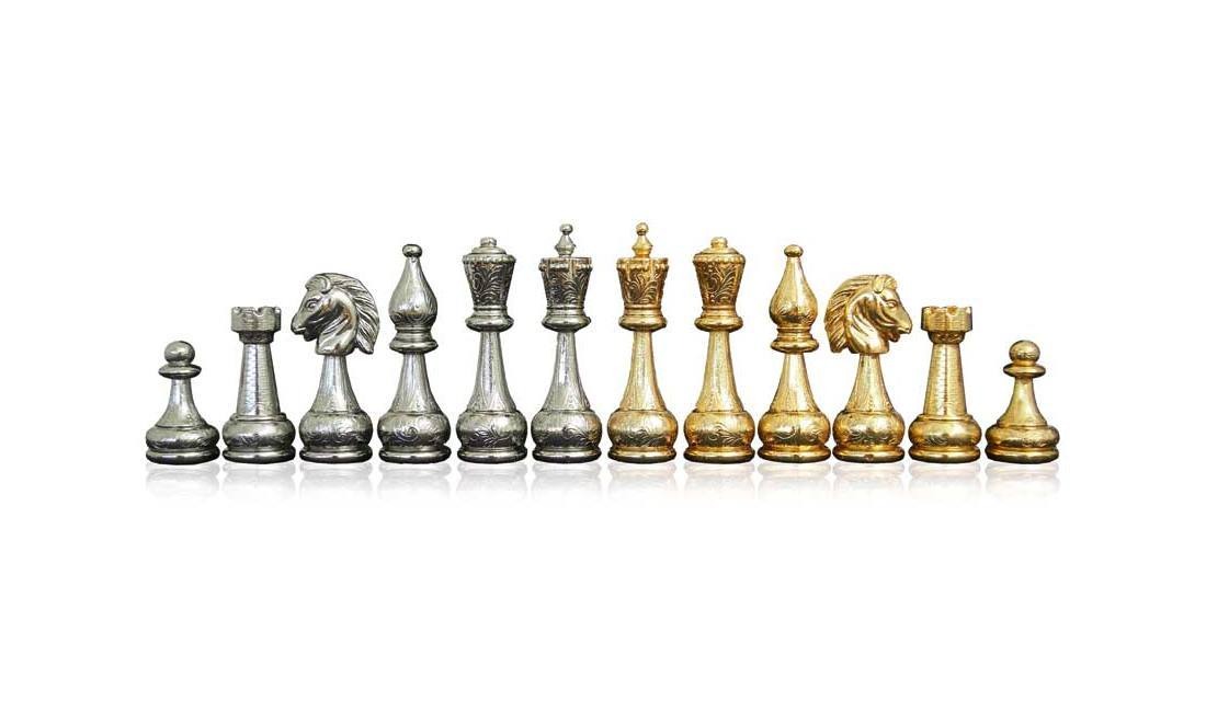 Un conjunto completo de juego de ajedrez compuesto por piezas de ajedrez completamente hechas a mano y que cuentan con un chapado en oro y plata.