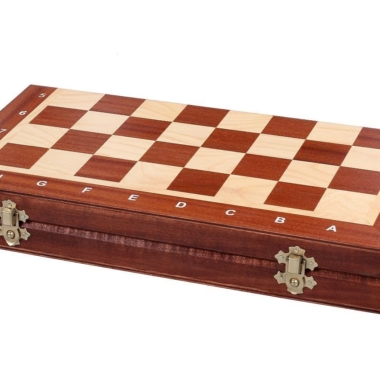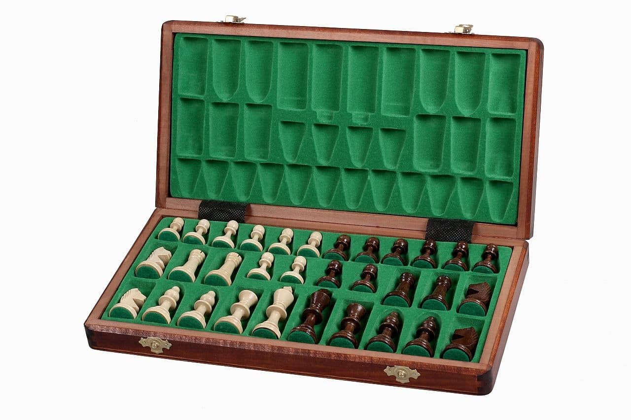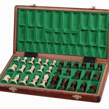 Se asocian a un tablero de ajedrez de madera de sicomoro y caoba de dimensiones 34,5 x 34,5 x 2,5 cm abierto (34,5 x 17,5 x 5 cm plegado).