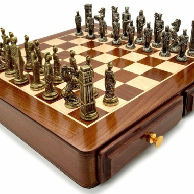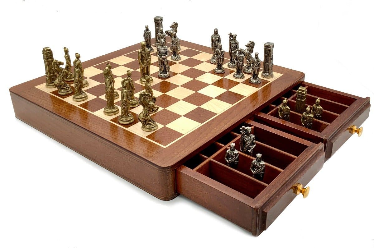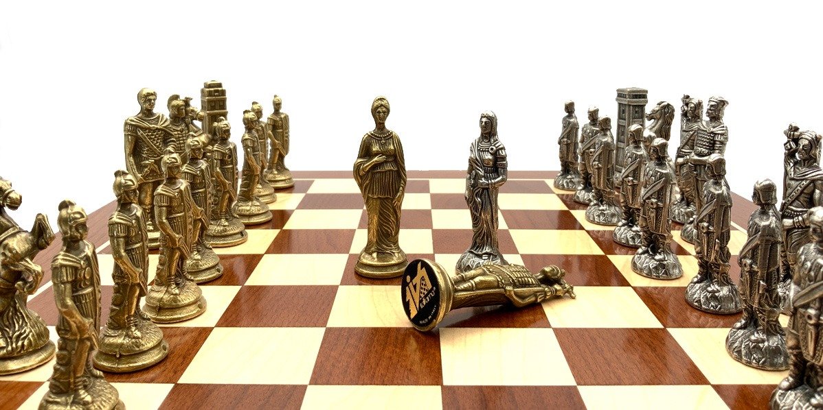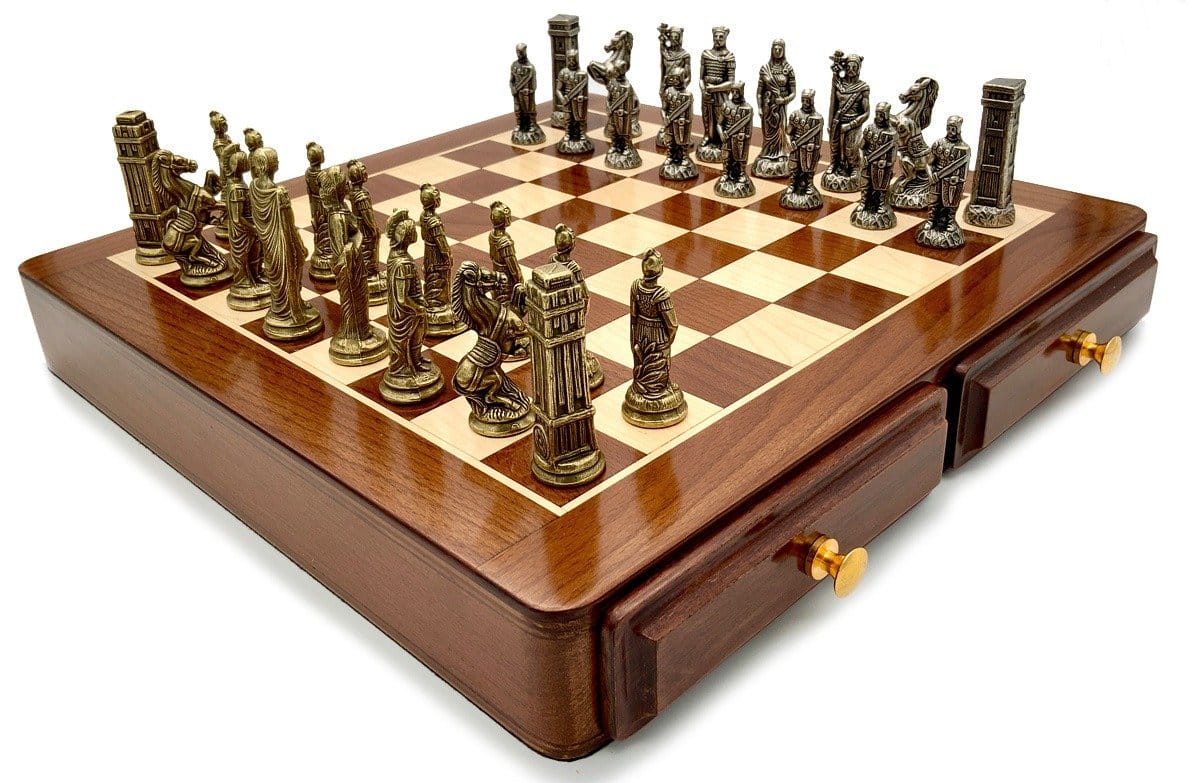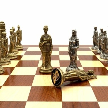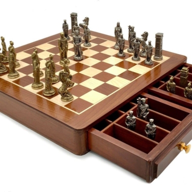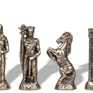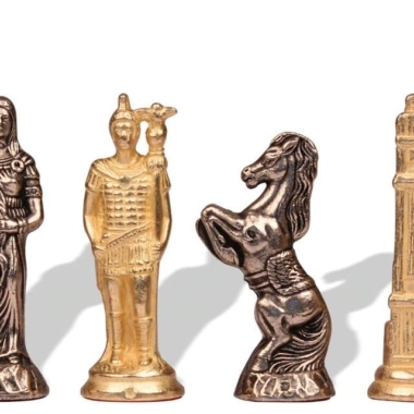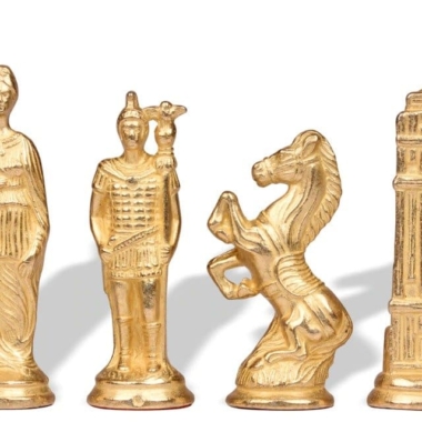 Las piezas de ajedrez están realizadas en metal, esculpidas y cinceladas a mano; muy elegantes, representan a las legiones romanas en su feroz lucha contra las tropas bárbaras.