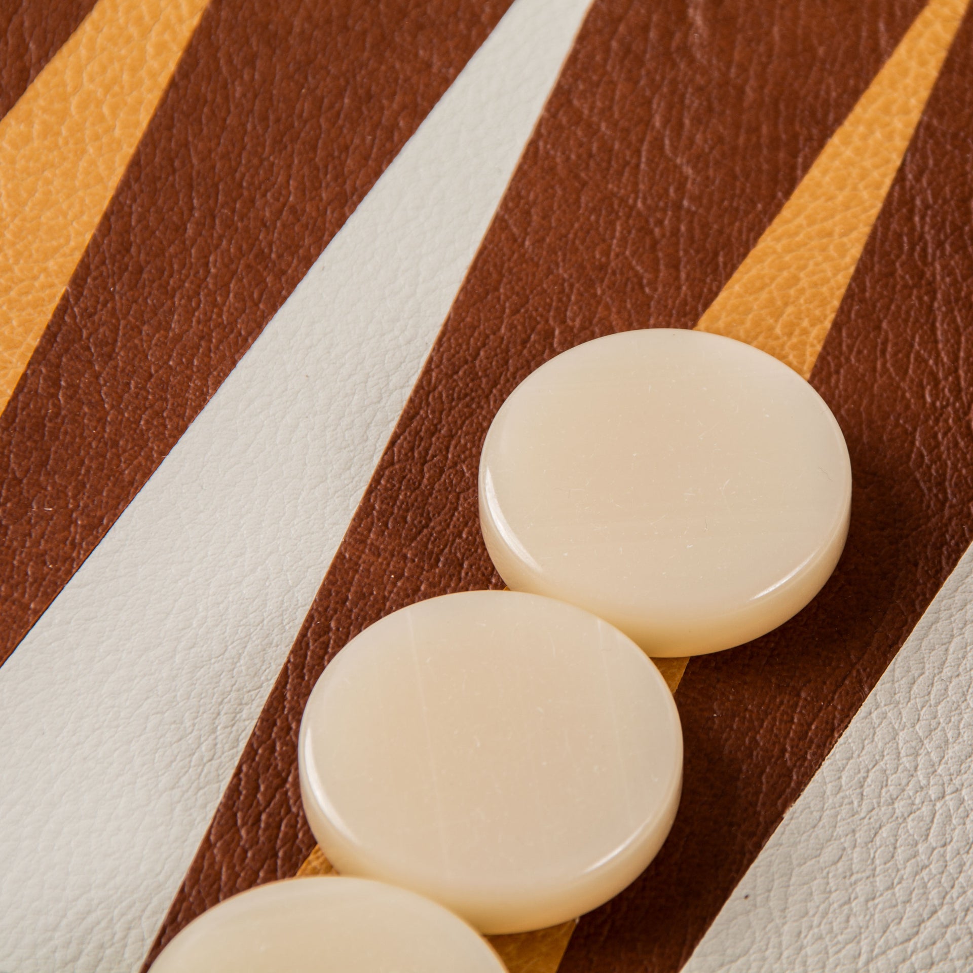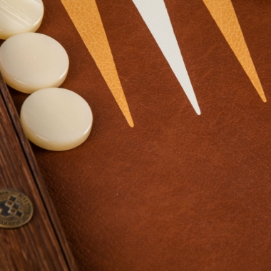 Este backgammon se distingue por sus dimensiones generosas de 48 x 30 cm, ofreciendo un espacio de juego cómodo para partidas desenfrenadas. Los colores marrón antiguo, combinados con las puntas en colores tabaco y marfil, crean un contraste elegante que atrae la mirada.