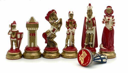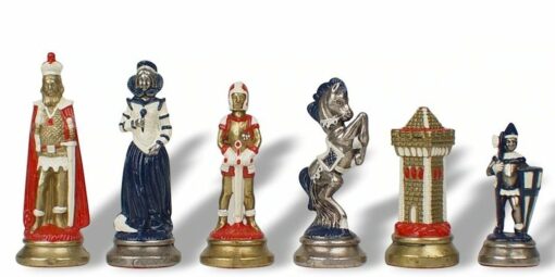 Las piezas de ajedrez están totalmente talladas, pulidas y pintadas a mano en un tema medieval de azul y rojo.