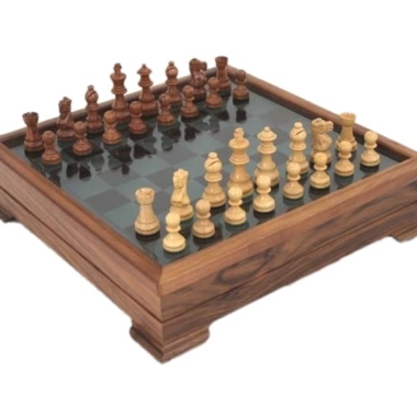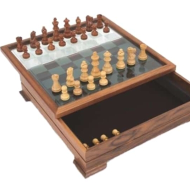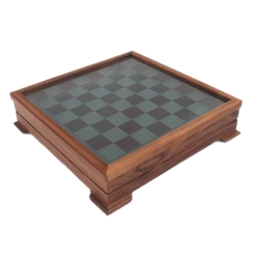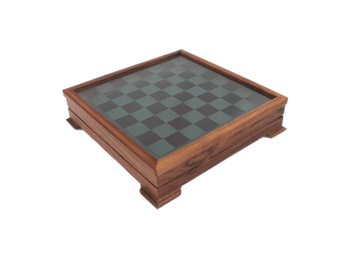 Vienen acompañadas de un tablero de ajedrez con un trabajo cuidado realizado en madera de nogal con un bonito tablero de vidrio. Con unas dimensiones de 38,5 x 38,5 cm y una altura de 9,5 cm, su tablero se levanta para descubrir un espacio de almacenamiento para el set de piezas de ajedrez.