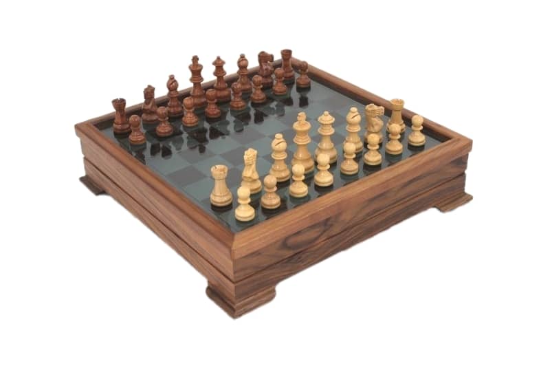 Tablero de Ajedrez Base de Madera de Nogal y Tablero de Vidrio y Piezas de Ajedrez Staunton de Madera con Almacenamiento