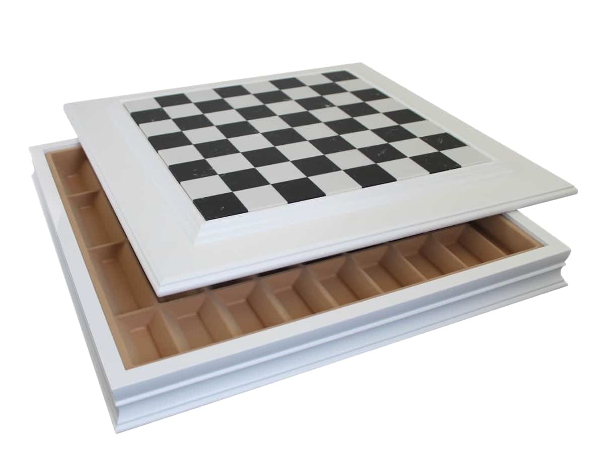 Tablero de Ajedrez de Madera Lacada Blanca y Tablero de Mármol Negro y Blanco con Almacenamiento