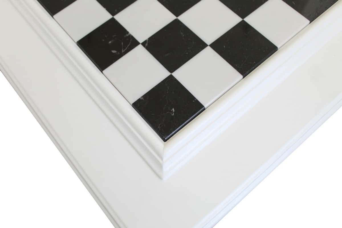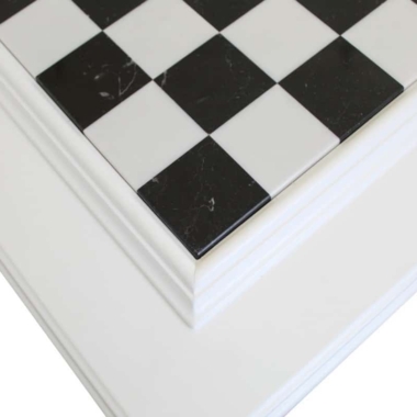 El tablero de ajedrez es una verdadera maravilla, realizado a mano por un artesano italiano especializado en la fabricación de juegos de ajedrez, la base es de madera lacada blanca con un marco moldurado y el tablero de juego es de mármol negro y blanco.