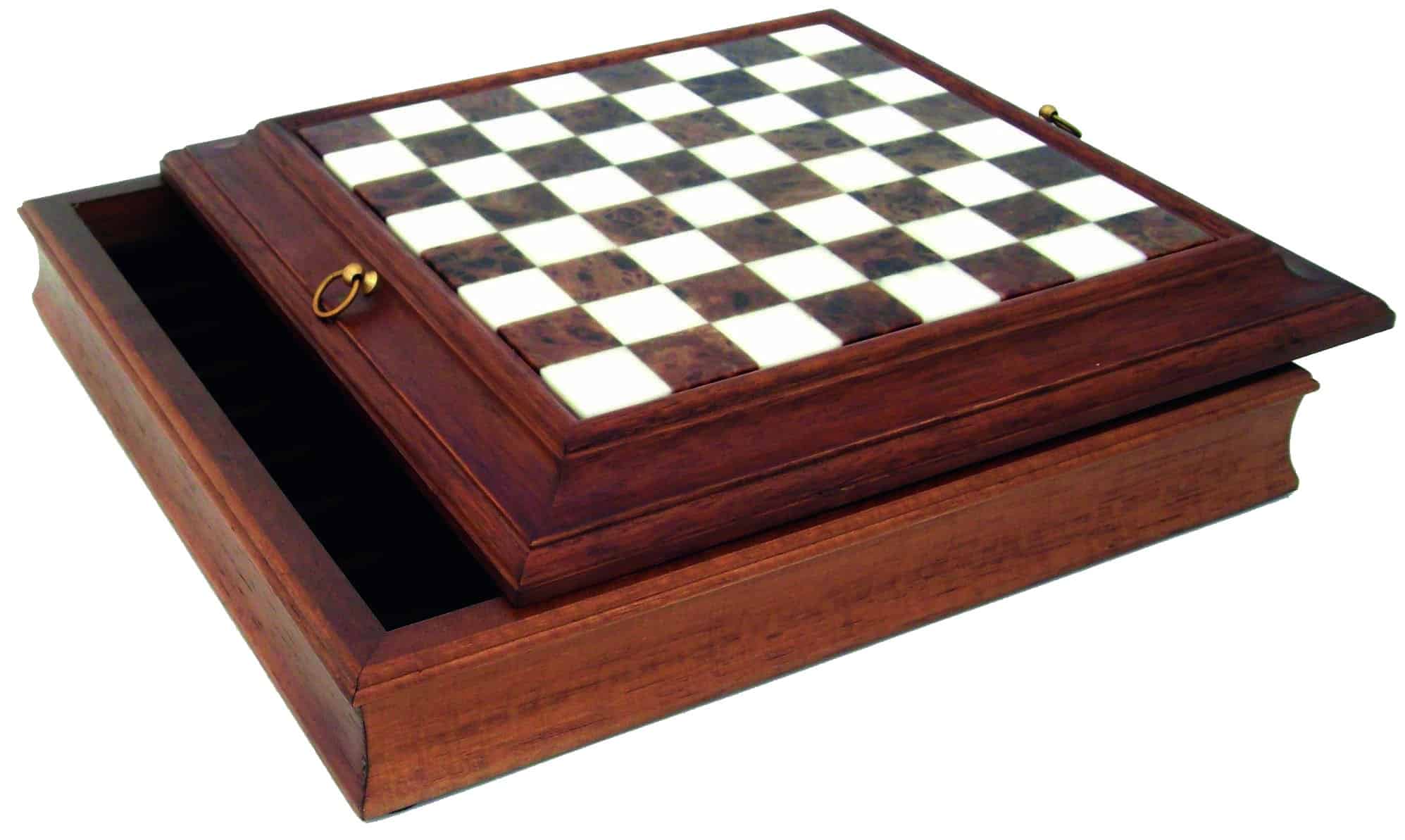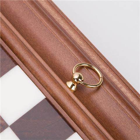 Se han colocado anillos de metal en el lado que permiten levantar fácilmente el tablero de juego de ajedrez y guardar las piezas.