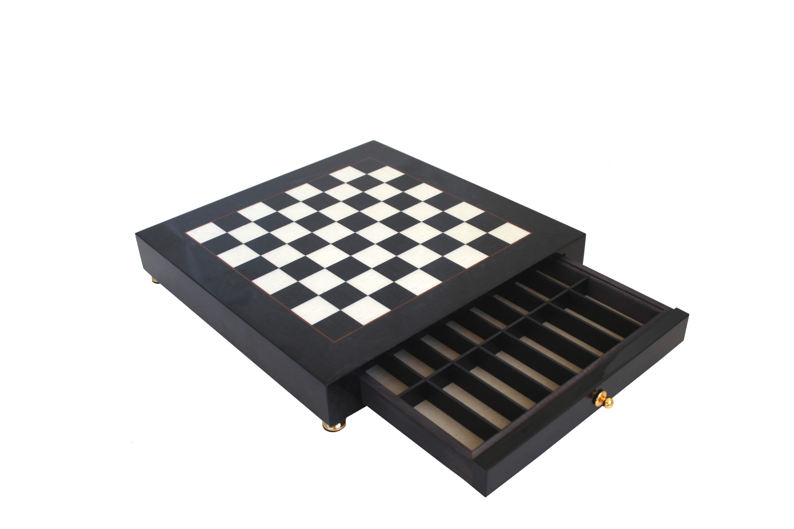 Tablero de ajedrez de diseño en negro y blanco, de dimensiones cómodas con un tamaño de 42 x 42 x 6 cm. Incluye un cajón de almacenamiento que permite guardar un set de piezas de ajedrez.