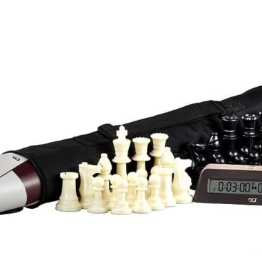 Se trata de un set de torneo profesional de juego de ajedrez. El set de torneo incluye un reloj electrónico de ajedrez DGT 1002 (los relojes fabricados por la empresa neerlandesa DGT son uno de los mejores y más populares relojes de ajedrez del mundo), un set de piezas de ajedrez de plástico Staunton ponderadas (altura del rey 9,6 cm) con 2 reinas adicionales, un tablero de ajedrez enrollable de vinilo de 51 x 51 cm y una bolsa para guardar y transportar el conjunto.