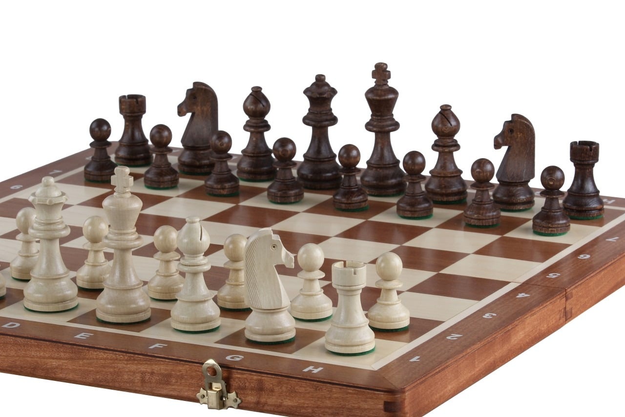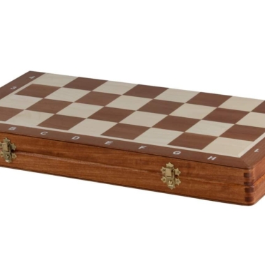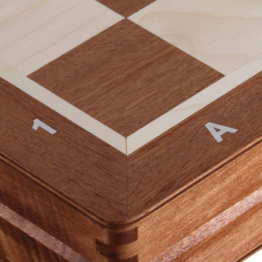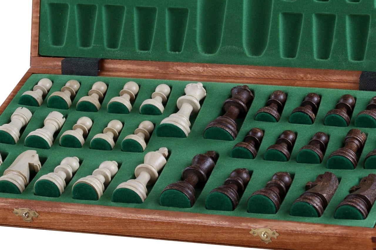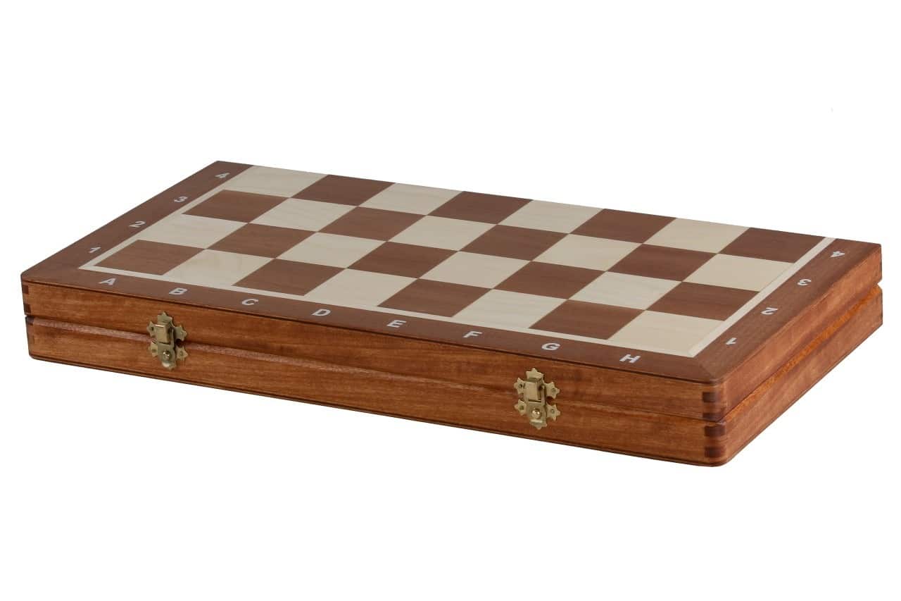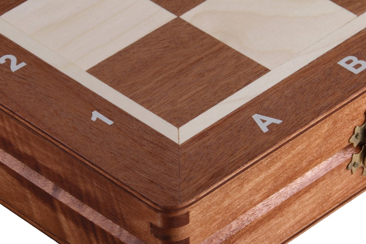 Conjunto de juego de ajedrez de madera de tamaño 5 compuesto por un tablero de 48 x 48 cm plegable de madera de caoba y sicomoro.