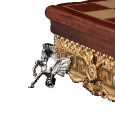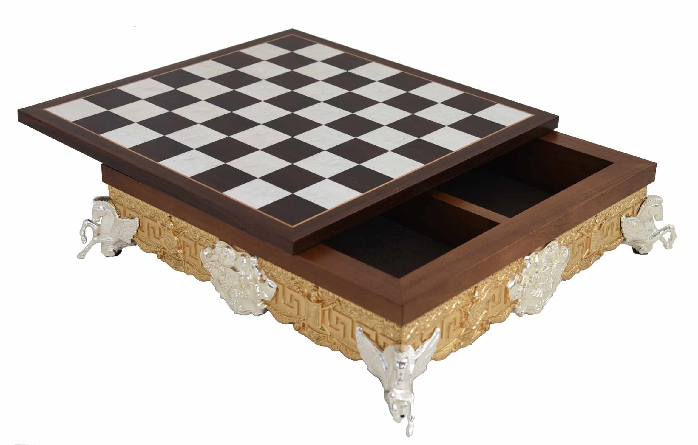 Acabado : Pies de metal chapado en plata esculpidos con caballos alados y borde de metal chapado en oro. Acabado lacado. Compartimento de almacenamiento integrado.
